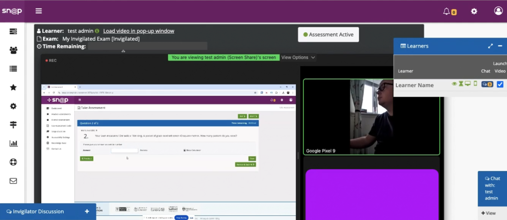Staff can view a learer's screen and smartphone video, as well as chat to other invigilation admins: