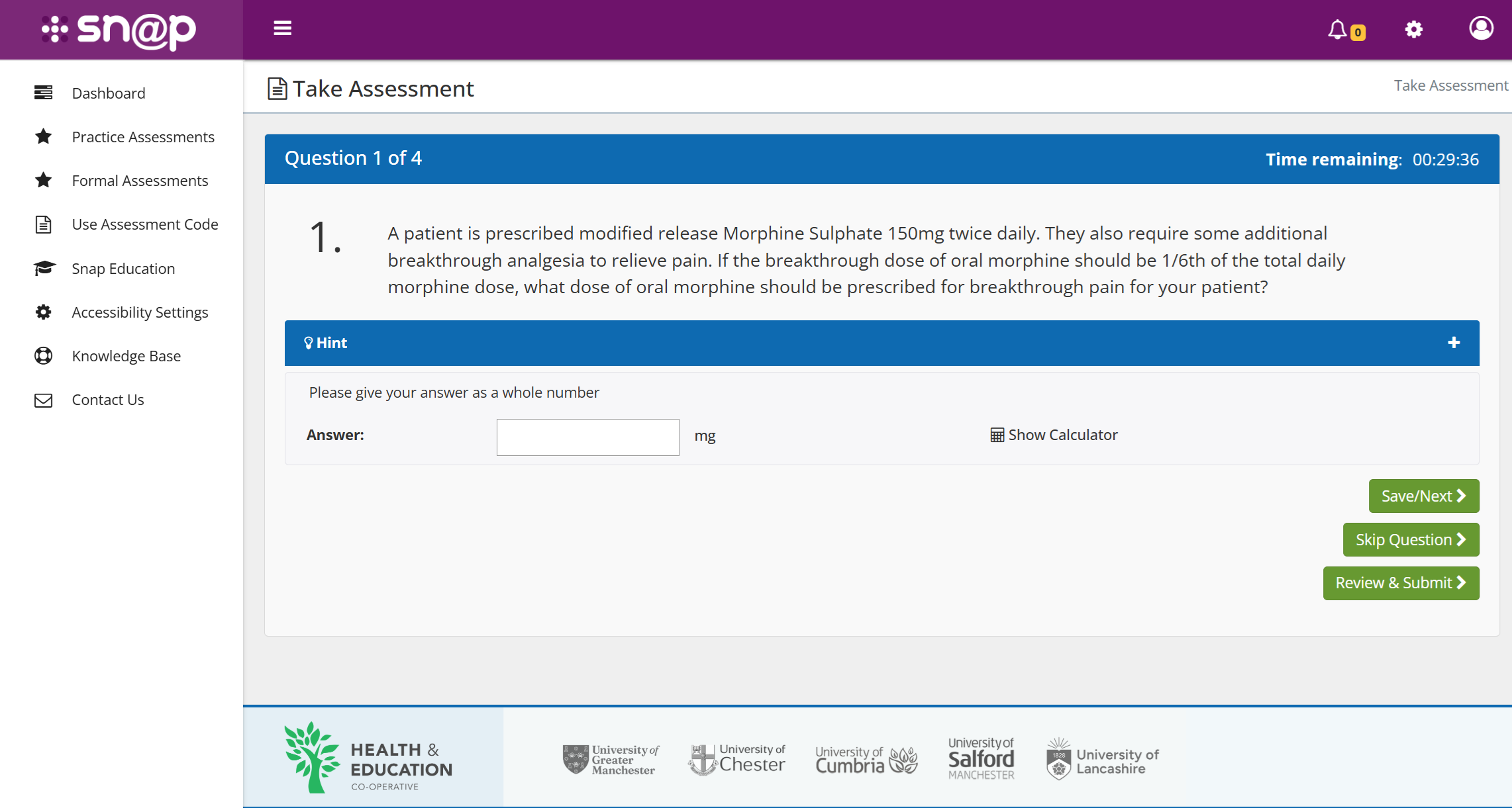Snap has allowed us to save time on producing assessments on clinical numeracy, while still allowing the flexibility to add as many custom questions as we need. As such, our provision of medicines management assessment has become more comprehensive, with more formative assessment provided, and ultimately improved clinical competency for our students. The system is easy to navigate for admin users, and the support provided is very impressive. The team are always open to suggestions to change functionality or better suit our institution's needs. They are all very approachable and responsive to long-term planning.